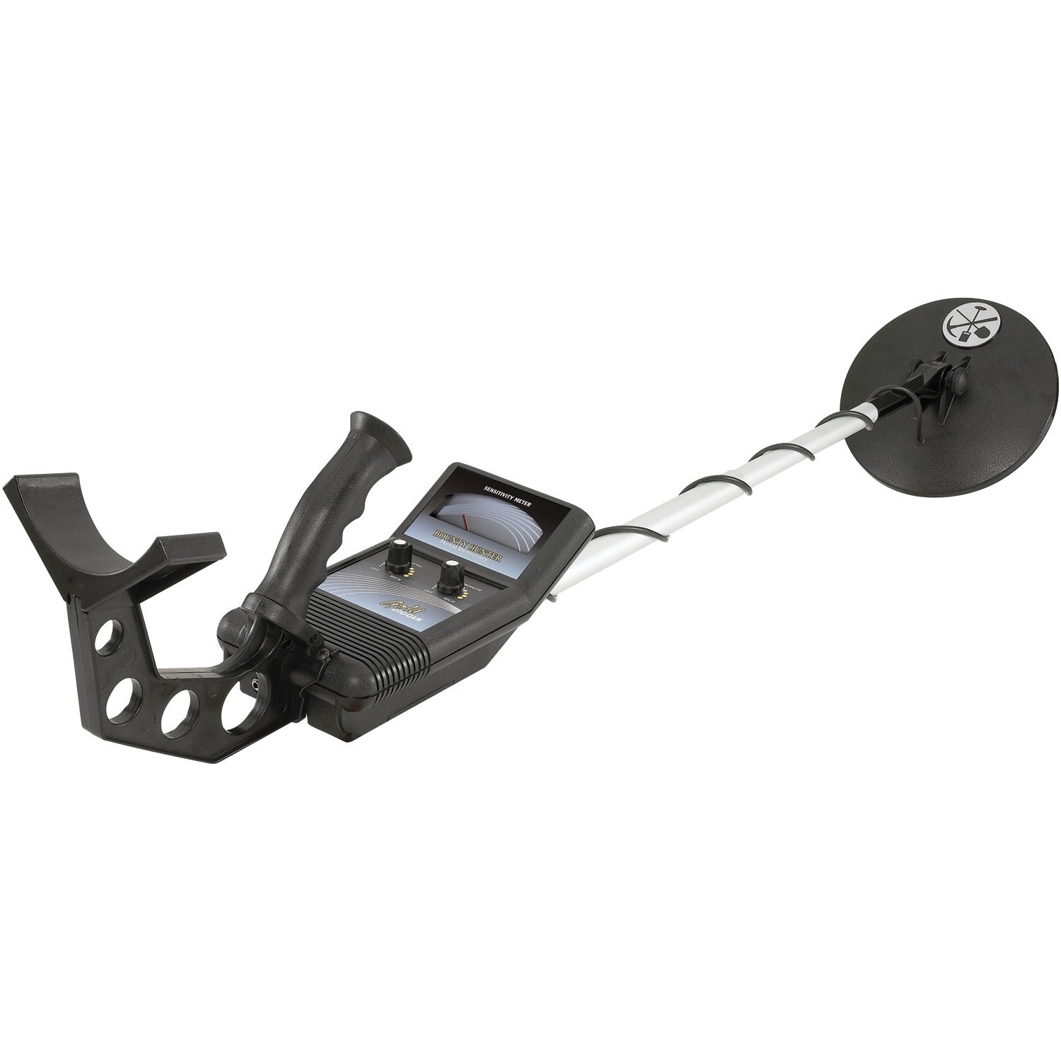 • 7-in. waterproof concentric closed search coil;• Detects coin-size objects up to 6 in. deep; larger objects up to 2 ft. ;• 1 search mode plus discrimination mode; trash eliminator control removes unwanted items;• Adjustable sensitivity and knob control interface;• Dual-tone target identification ;• Automatic tuning and preset ground balancing to "see through" ground minerals;• Includes earphones;• Requires two 9-volt batteries (sold separately);• 1-year limited warranty;